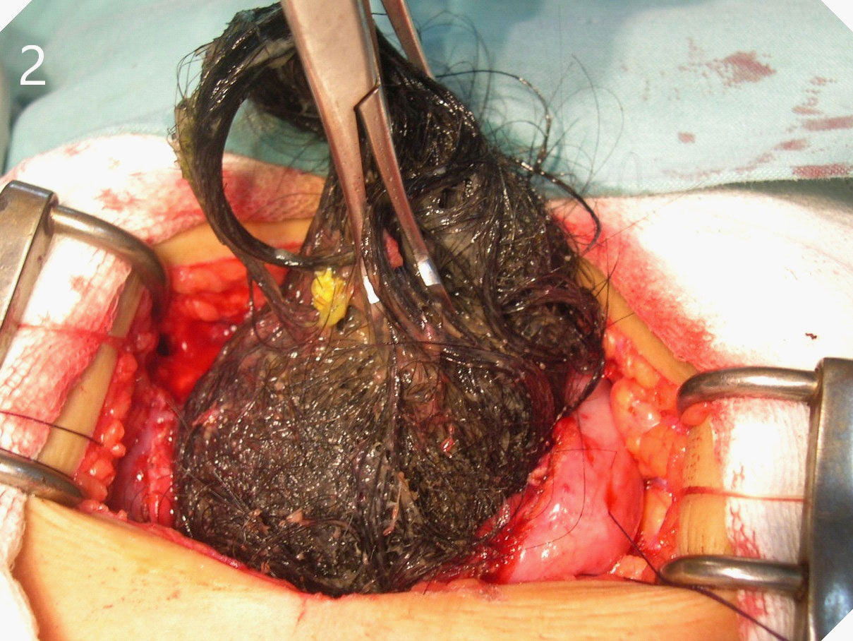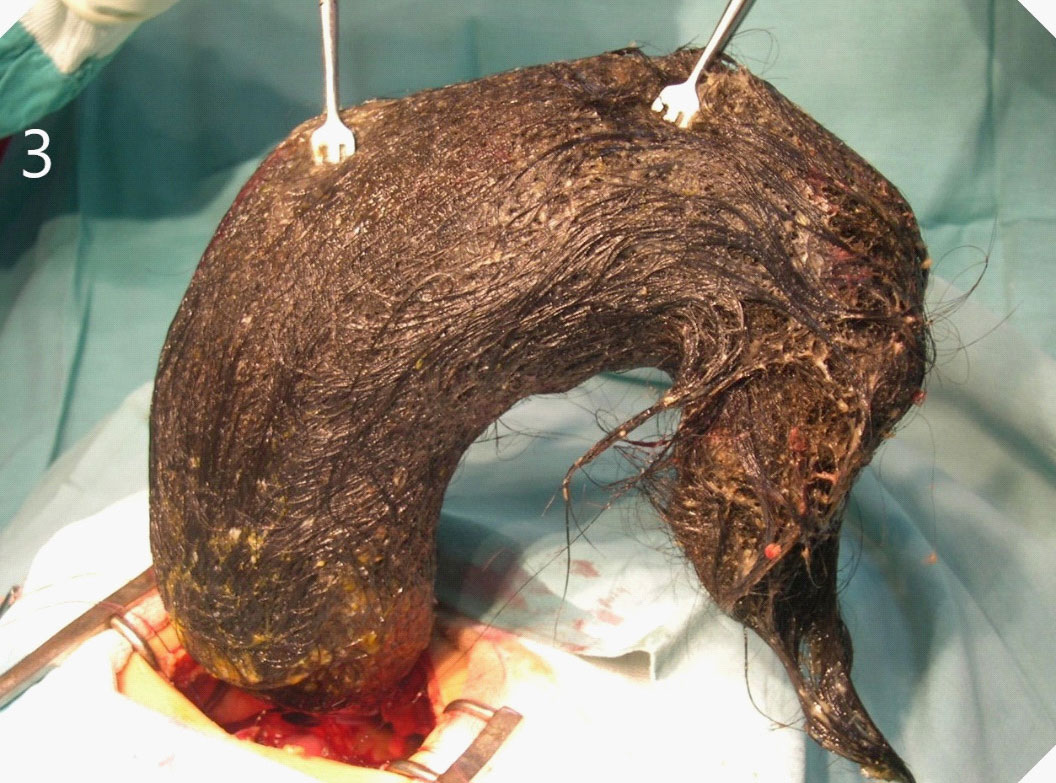 A trichobezoar is a rarely encountered mass of hair, wool, and similar material in the stomach and intestine of some patients with trichotillomania and trichophagia. The accumulated hair within the stomach and intestine is resistant to digestion, which occasionally presents as trichobezoar-induced bowel or gastric outlet obstruction. Trichobezoars are more common in paediatric age than adults, with up to 90% occurring in girls [1-3]. This report aims to describe the case of a young woman with an obstructive trichobezoar of the stomach and duodenum.