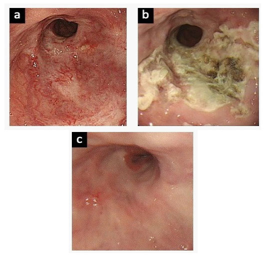 However, the patient was transported to the emergency room 52 days later due to melena, and she received emergency EVL because of distal esophageal bleeding. Subsequently, she complained of haematemesis or melena every 2 to 4 months, due to ruptures of small blood vessels in the distal esophagus (Figure 2) (Table 1). As a result, emergency EVL was carried out a total of nine times, despite additional oral drug treatment including beta-blocker and proton pump inhibitor for prevention variceal bleeding during the clinical course. Finally, she was admitted again two weeks after hospital discharge due to melena (Table 1), and we have discussed the clinical management of this patient at our multidisciplinary GI meeting. She was suspected of having a combination of CREST syndrome and PBC and may have had variceal bleeding rather than hemorrhagic telangiectasia in the distal esophagus. The patient underwent argon plasma coagulation (APC) therapy as scheduled through the working channel of the endoscope under direct visualization using an electrosurgical generator (ERBE ICC 200; ERBE USA, Marietta, Ga) and a 2.3 mm probe (argon gas flow, 1.0-2.0 L/min; power 60 W). There was no active bleeding noted during the gastroscopic examination, and the lesions were treated successfully with APC (Figure 3-a,b). During a follow-up period of more than 36 months, there was no further recurrent bleeding (Figure 3-c).
