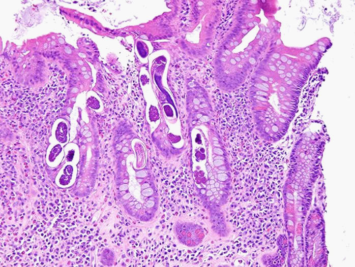 The pathology revealed worms suggestive of Strongyloides (see Figure 2). Upon further questioning, the patient was born in the Dominican Republic and moved to the United States more than 10 years ago but he denied history of recent travel. The patient was started on ivermectin which was then switched to praziquantel given concern of inadequate absorption due to ileus. The patient clinically improved with cessation of bleeding. A subsequent ERCP was performed to rule out biliary obstruction which was normal, and his liver chemistries significantly improved. He was discharged to complete a 14-day course of praziquantel from his first negative ova and parasite stool exam.