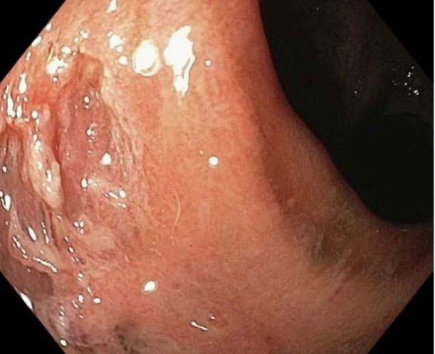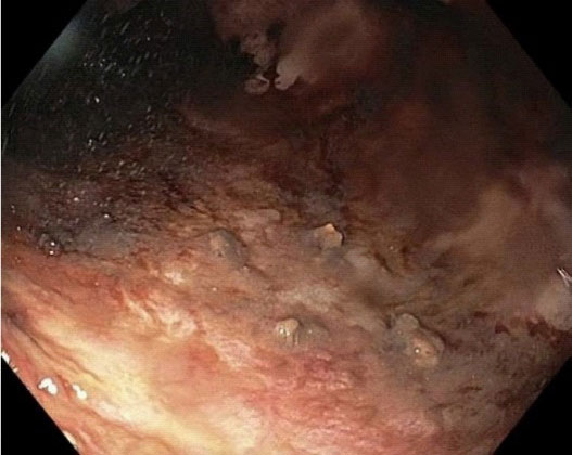 A 60 year old male with a recent diagnosis of C. difficile colitis was admitted to the emergency department with syncope and failure to thrive. His past medical history was notable for chronic inactive hepatitis B, peripheral T cell lymphoma on azacitidine and cyclophosphamide, doxorubicin, vincristine, and prednisone, and chronic HLTV 1-2. The patient reported 6 days of nausea, vomiting and watery diarrhea occurring approximately 2-3 times daily, with associated petechial rash over his torso as well as all four limbs. On examination he was found to be tachycardic and hypovolemic which responded well to fluid resuscitation. Physical examination was notable for a bilateral petechial rash on his legs, arms, and torso, the rest of the examination was unremarkable. His labs were notable for hemoglobin of 11.3 g/dL, normal white blood cell count, but with 90% neutrophilia, ALT 135 U/L, total bilirubin of 6.8 mg/dL, direct bilirubin of 5.6 mg/dL, and alkaline phosphatase of 221 U/L, and albumin of 1.6 g/dL. Abdominal US revealed gallbladder sludge and common bile duct of 9 mm, but MRCP did not show any choledocholithiasis or biliary dilation. On hospital day four, the patient acutely developed melena, hematochezia, hemodynamic instability, and hemoglobin nadir to 5.5 g/dL packed red cell transfusions requiring emergent EGD and flexible sigmoidoscopy showing diffuse mucosal oozing in the upper and lower GI tracts with ulcers with a moth-eaten appearance (Figure 1). Biopsies were taken.