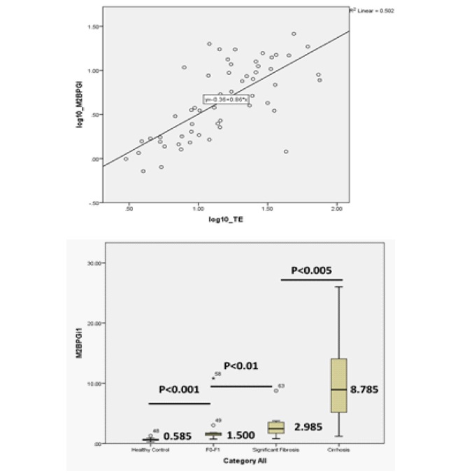 Patients: Based on the Pearson correlation analysis, the level of serum M2BPGi was found to have a strong positive correlation with the liver stiffness measurement by Transient Elastography (r=0.708, p<0.001) (Figures 1a). Moreover, the median level of serum M2BPGi increased significantly according to the severity of liver fibrosis stages as 1.50 COI for F0-F1, 2.985 COI for significant fibrosis (F2-F3) and 8.785 COI for cirrhosis (≥F4). The analysis also showed that the level of M2BPGi between healthy control and F0-F1 Hepatitis C group differed significantly (0.585 COI vs 1.500 COI, p<0.001) (Figures 1b).