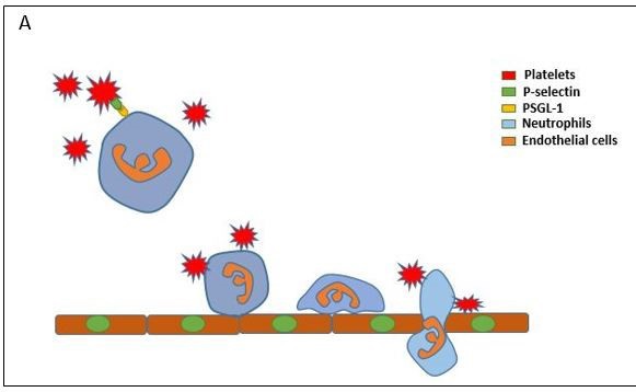 Platelets are small cells (2-3 µm) and unnucleated fragments that derived from megakaryocytes. Although they are not eukaryotic cells, platelets have mitochondria and endoplasmic reticulum residuals as well as they contain three different types of granules: alpha- granules, dense granules and lysosomes. These granules store variety of proteins and compound that have a critical role in both physiological and patho physiological conditions [16]. Having established that neutrophil infiltrated from circulation into inflamed and infected tissue in a gradual process with well-define sequential steps. Indeed, platelets have implicated to provoke all these steps from tethering to migration [10]. During inflammatory conditions, the adhesion molecules on the surface of platelets and endothelial cells are upregulated and that can led to slow down neutrophil movement in the circulation via forming a physical bridges providing a substantial adequacy of adhesion of neutrophils on the vascular endothelium [10] (Figure 1).