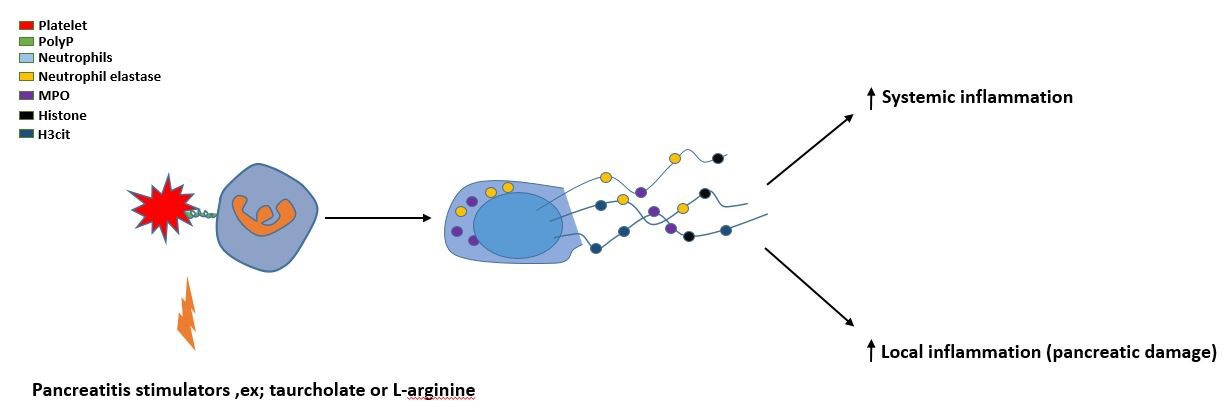 Growing body of evidences has shown that activated neutrophils produce various inflammatory mediators such as neutrophil-derived reactive oxygen species (ROS), matrix metalloproteinase-9 (MMP-9) and elastase can be involved in the tissue damage in AP [11,12]. Activated neutrophils have been observed to use another mechanism called NETosis. It is process by which activated neutrophils release web-like structures consist of neutrophil-derived DNA decorated with nuclear histones, granular and cytoplasmic proteins, called neutrophil extracellular traps (NETs) [13,14]. NETs has recently shown to play a key role in in trypsin activation, neutrophil recruitment and tissue injury in AP [15]. In this review, l defines the essential role of platelets in neutrophils recruitment and NETs formation in AP.