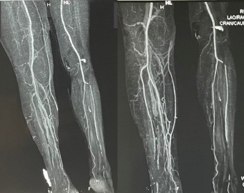 The following day the patient was sent to computed tomography (CT) angiography of the lower extremities. The CT angiogram (Figure 1) showed normal, patent vascular structures without contrast media extravasation. Notable CT abnormalities were swelling of the thigh and multiple loculated fluid collections with air inclusions in the knee region. Additional findings were the presence of free intraabdominal fluid, enlarged cirrhotic liver with portal vein dilatation and splenomegaly. The diagnosis of decompensated liver cirrhosis with severely impaired coagulation was established and the patient was transferred to the Clinic for gastroenterohepatology. Further treatment at our clinic included continuation of transfusions with FFP and packed RBC as needed as well as initiation of standard supportive treatment for decompensated liver cirrhosis with nonselective β-blocker (carvedilol) and diuretic therapy. Assessment regarding the etiology of cirrhosis established alcohol as the causative agent. Despite treatment with blood derivates (7 RBC units and 6 FFP units since initial presentation), a drop-in hemoglobin was noted on several control laboratory analyzes, raising suspicion of ongoing bleeding. Follow-up coagulation profile confirmed persistence of severely impaired clotting ability. After consultation with the traumatologist and transfusiologist, tranexamic acid (tid 0.5 g), cryoprecipatate (10 doses/daily) and enoxaparine (bid 40 mg) were included in the treatment. In the following 5 days there were no signs of ongoing bleeding while laboratory results showed steady improvement in hemoglobin and hematocrit level. The swelling of the right knee and the bluish-black discoloration slowly withdrew. Screening gastroscopy was performed and small straight esophageal varices were detected. After 16 days of hospital treatment the patient was discharged in stable condition. The patient was recommended a complete alcohol abstinence and regular follow up at our outpatient clinic. Up till this moment the patient is in improved and compensated condition in terms of the cirrhosis.