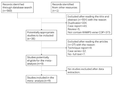 Results: Totally 9 observational studies with a total of 958 patients were included in the final analysis. The meta-analysis demonstrated that RAMPS had more lymph-node retrieval numbers (MD, 4.82, 95%CI (1.81~7.83); P=0.002), shorter postoperative hospital stay (MD, -4.97, 95%CI (-9.70~-0.25); P=0.04) and decreased intraoperative blood loss (MD, -185.63, 95%CI (-212.41~-158.85); P<0.001) compared to CDP. There were no significant differences between the two groups with respect to operative time (MD, -5.44, 95%CI (-52.58~-41.69); p>0.05), R0 resection rate (OR, 1.55, 95% CI, (0.78 ~ 3.10); p>0.05), overall complications (OR, 0.66, 95%CI (0.23~1.87); p>0.05), overall survival rate (OR, 1.30, 95%CI (0.46~3.69); p>0.05).