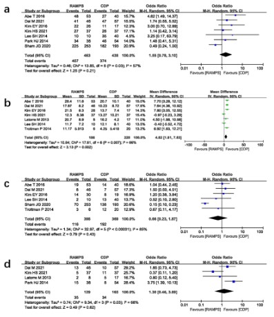 294 patients were involved in four included studies reported the overall survival rate [13,14,20,21]. Heterogeneity was detected (P=0.03, I2 =68%), and the random-effects model was used. The overall survival rate was 27.13% (35/129) in the RAMPS group and 20.61% (34/165) in the CDP group. Overall analysis revealed no significant difference between RAMPS and CDP [OR 95%CI, 1.30(0.46~3.69); P=0.62] (Figure 2d).