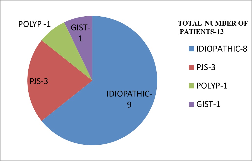 Results: Of 13 cases, 2 cases underwent hydrostatic reduction one case failed and underwent emergency laparotomy and resection anastomosis,6 cases underwent operative reduction, 4 cases underwent resection anastomosis, 1 case of PJS underwent operative reduction and polypectomy, 1 case of PJS underwent resection anastomosis and polypectomy, 1 case of PJS refused surgery and expired.