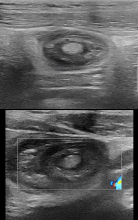 A 15-year-old male patient, with a history of intermittent abdominal pain, two episodes of bleeding considered to anal fissure, and of chronic constipation consulted twice in the emergency department for ileo-ileal intussusception more than a year apart. At the first presentation, the patient consult with the general condition preserved, apyrexia, bilious vomiting. The physical examination found pain in the right hypochondrium and sub umbilical, a soft abdomen, no tusks or palpable abdominal mass. The ultrasound performed found ileo-ileum intussusception without any sign of complication with the intussusception tube in the pelvic position (Figure1).