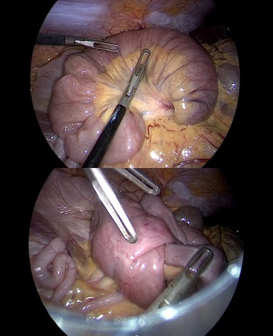 An urgently laparoscopy management found an ileo-ileum intussusception sausage in the epigastric region. The partial laparoscopic reduction of the small intestine discovers a mesenteric fat and did not complete reduction (Figure 4). A conversion to the periumbilical minilaparotomy using the Alexis retractor was done and found the MD approximately to 60 cm from the Bauhin's valve with good staining, without necrotic lesions (Figure 5). Subsequently, a segmental small-bowel resection with primary anastomosis was performed.