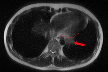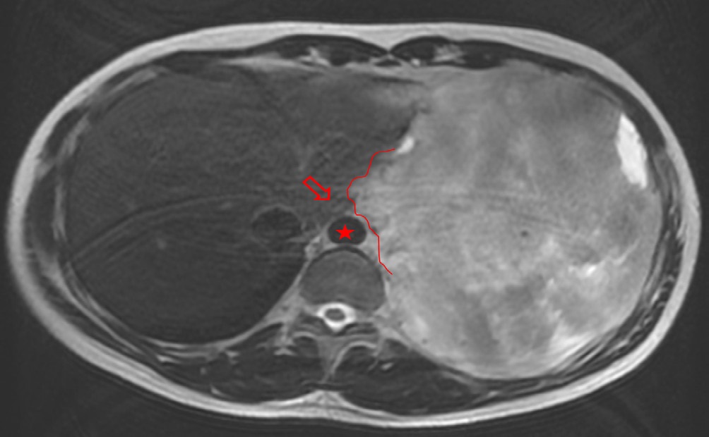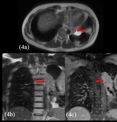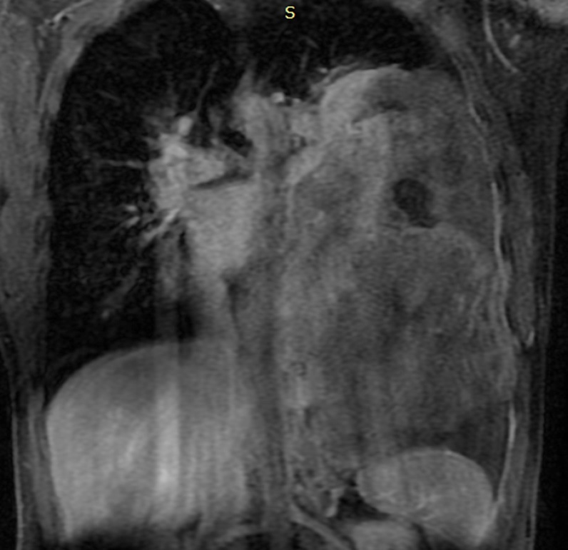 A 28-year-old male patient presented with onset of pain on his left hemithorax and progressive fatigue, in September, 2020. He had no previous comorbidities. An investigative MRI (magnetic resonance imaging) scan showed a large and heterogeneous mass on his left hemithorax with partial lung atelectasis, inferior displacement of diaphragm, mediastinal shift to the right and small pleural effusion (Figures 1a, 1b and 1c). The tumor was in contact with the inferior esophagus and the descending aorta. The thoracic wall (muscle and ribs) was not compromised. These findings suggested, possibly, a mass of pleural origin. An initial core-needle biopsy was performed in October, 2020 to clarify the diagnosis.