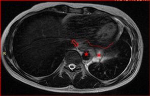 The patient presented with voluminous and symptomatic disease less than six months of chemotherapy end and less than two months of radiotherapy. He restarted with pain in left hemithorax, cough, shortness of breath, lack of appetite and daily vespertine fever. MRI scans in August, 2021 showed new lesions on pleural surfaces beyond the residual mass previously seen (Figures 4a, 4b and 4c). One of the lesions, on the extra-pleural fat adjacent to the diaphragm, extended inferiorly, pushing downward the muscle.