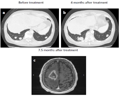 The patient started to take lenvatinib for 12 mg per day. After administration of lenvatinib, his liver function was maintained, indicated by CP-A liver function (score 6). At 3.5 month after initiation of lenvatinib, repeat CT assessment showed no significant increase in the size of hepatic tumors (Figure 1e), corresponding to Stable Disease (SD) by mRECIST. However, further progression of PVTT was observed (Figure 1f). At the same time, left hemiplegia suddenly occurred, and brain magnetic resonance imaging (MRI) indicated a metastatic tumor (Figure 2c). Therefore, lenvatinib administration was immediately stopped, and radiation therapy was initiated for brain metastasis. After the patient recovered from this brain metastasis, ruptured esophageal varices caused acute bleeding. Following emergency endoscopic treatment, his liver function and general condition deteriorated, and he died at 8.5 months after initiation of treatment. Clinical course is summarized in Figure 3.