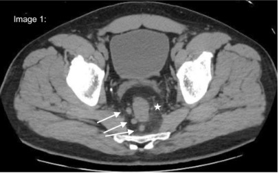 Physical examination had no alterations besides worsening pain with deep palpation in the referred areas. Cell blood count and comprehensive metabolic panel were normal, only C-reactive protein was increased. A Computerized Tomography scan (Figure 1) presented significant parietal thickening of the lower rectum, with densification of mesorectal fat and adjacent lymph nodes enlargement. He was admitted for further investigation and pain management. Inflammatory bowel disease and infective colitis were initially suspected.