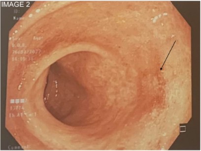Colonoscopy (Figure 2) was performed and found an enanthematous, friable mucosa. There was loss of the usual vascular pattern, with numerous punctate, shallow, fibrinous bottom, flat edges erosions. Some were confluent, distributed circumferentially in the distal 10 centimeters of the rectum. A dry swab confirmed the diagnosis of Mpox. HIV, chlamydia and gonorrhea testing were negative.