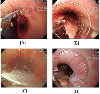 The most commonly used accessory device for foreign body removal was retrieval forceps (n=123, 65.1%), followed by net (n=42, 22.2%), snare (n=13, 6.9%), and endoscopic push (n=10, 5.3%) (Table 4). Regarding the foreign body, 67 of 70 cases (95.7%) of fish bone were successfully removed using retrieval forceps. The net was successfully used in 27 of 47 cases (57.4%) of food bolus, and of these cases, the retrieval forceps were also used in 3 cases. In 8 cases, after removing some part of the food bolus with a net or a snare, the food was pushed into the stomach with an endoscope. Retrieval forceps were used in 87.5%, 64.3%, and 92.3% of cases of seashells, animal bone, and PTP, respectively, while the net was used in 50% and 60% of cases of hexagonal stone and dental prostheses, respectively (Table 4) (Figure 1).
