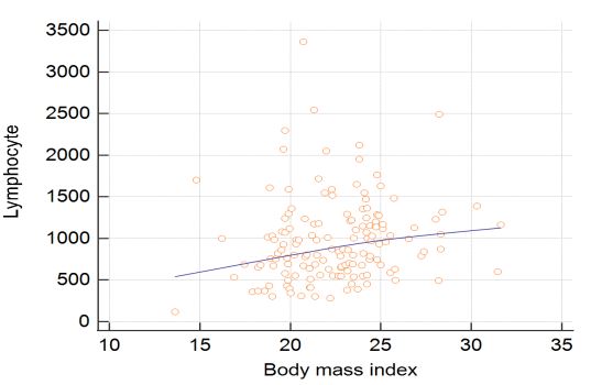 Table 2 identifies the factors related to occurrence of lymphocytopenia induced by preoperative CRT. Non-DM patients had higher rates of lymphocytopenia compared to DM patients (p=0.006). Normal-weightor underweight patients had higher risk of lymphocytopenia compared to overweight patients (p=0.001). Figure 1 shows the correlation between lymphocyte nadir and BMI (p=0.076). Old age and hypertension were not related to occurrence of lymphocytopenia.