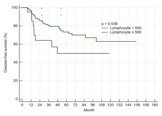 Figure 2 shows the relationship between lymphocytopenia and DFS. Lymphocytopenia is associated with reduced DFS (p = 0.038). Figure 3 showed the relationship between OS and lymphocytopenia. OS was not significantly correlated with lymphocytopenia (p=0.124).