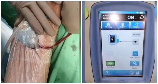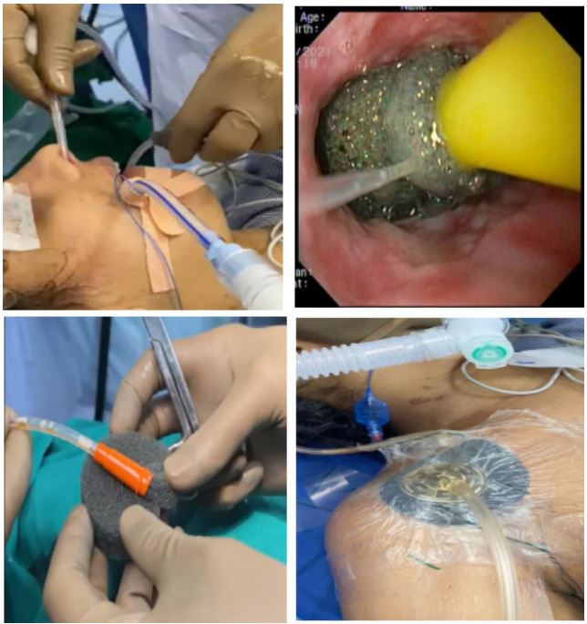 Overall, Evac therapy is considered a safe procedure characterised by a low incidence of adverse events. However, there are significant disadvantages associated with the conventional E-Vacs used for gastrointestinal leaks, including restricted accessibility and exorbitant expenses. The Eso-SPONGE kit consists of an open-pored sponge that is connected to a drainage tube, which is then linked to a low-vacuum pump. However, the utilisation of this device is restricted due to its limited availability in various centres and its high cost. The E-vac Endosponge, which has been modified using indigenous methods, is a vacuum therapy sponge that is specifically designed for the treatment of venous ulcers on the leg. The Ryles tube was inserted through the nasal passage and removed through the oral cavity. A sponge of suitable dimensions was prepared by cutting it to match the size of the cavity. The sponge was then carefully wrapped around the tip of Ryle's tube, ensuring that all the openings were covered, and secured in place using Ethilon sutures. The sponge, under the guidance of an endoscope, was carefully inserted into the cavity along with the RT. A portion of the sponge was intentionally left within the lumen. A second sponge, of an appropriate size, was affixed by obstructing the cavity at the distal end of the RT and positioned on the surface of the skin. The RT was connected to the endovac therapy unit, and the pressure was set at 120 mmHg. The application of continuous negative pressure induces mechanical deformation forces, resulting in both macroscopic and microscopic advantages. The vacuum forces also stimulate local angiogenesis by causing a temporary reduction in blood flow and activating the hypoxia-inducible factor-vascular endothelial growth factor pro-angiogenic pathway. This results in an observable increase in both blood vessel density and blood flow in the specific area.