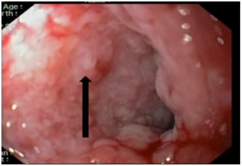 A 65 year lady a case of squamous cell carcinoma of lower end of oesophagus, she has received neoadjuvant chemoradiotherapy and underwent total esophagectomy and gastric pull up, 2 weeks later she presented with fever and shortness of breath after routine work up CECT chest and upper abdomen was done s/o 7mm defect in posterior wall of pulled up stomach at the level of D 6 vertebra with the leak of oral contrast forming a 6.5 x 2.2 x 1.2 cm collection in right paravertebral region from D5 to D8 vertebral level. She was treated with IV antibiotics and other supportive measures. Upper GI endoscopy showed a large fistulous opening with an overlying slough in the posterior wall of the pulled-up stomach along the staple line (Figure 7). She continued to have a fever, so CT-guided pigtailing was done, and pus was sent for Culture sensitivity, and antibiotics were changed according to it. One week after the procedure, a repeat CECT chest and upper abdomen was done. The previously seen right posteromedial collection showed a decrease in size, but a contrast leak persists. She was continued with antibiotics and supportive measures. Her fever subsided, but for persistent fistulous openings, therapeutic options were excision of the stomach, esophagotomy, and covered stents. For the present case, we went ahead with indigenously modified E-Vac therapy, which was performed for a total of 26 days while the sponge was changed four times. During the first three changes, the sponge was placed directly into the cavity. Excellent granulation of the tissues around the leak was achieved, together with a progressive reduction of the cavity size and of the pleuro-mediastinal abscess (Figure 8). Daily output from the collection bag dropped After 6 weeks of initiation of the E-vac therapy, the cavity showed complete healing, a CT scan showed a small pseudodiverticulum but no leak, and she was started on a full oral diet.