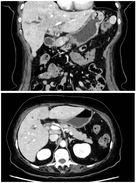 A 71-year-old female patient presented to the emergency department after having developed generalized icterus for one week, associated with inappetence due to epigastric pain with a recent weight loss of 15 kg, and intermittent night sweats. She was treated for hypertension and underwent a cholecystectomy in 2019 complicated with an incisional hernia. She did not smoke and had a family history of BRCA (Breast Cancer Gene) associated breast cancer found in both blood-related sisters. However, she was never tested. Physical examination revealed scleral and generalized jaundice with right upper quadrant tenderness with no overt lymphadenopathy or abdominal mass except for the incisional hernia. Liver panel revealed the following results: aspartate aminotransferase, 234 U/L; alanine aminotransferase, 182 U/L; alkaline phosphatase, 1060 U/L; total bilirubin, 848 mg/dL; direct bilirubin, 143 mg/dL; serum levels of lipase were 63 U/L. Tumor marker for CA19-9 was elevated: 241 kU/l.