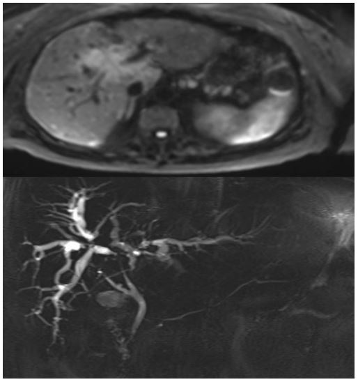 Initial image findings are highly susceptive of a hilar cholangiocarcinoma due to the central hepatic infiltration with occlusion of the biliary convergence leading to complete separation of the left and right intrahepatic bile ducts and the hilar adenopathy. The ERCP was also suggestive of a possible hilar cholangiocarcinoma. However, brushings were negative for malignant cells. Lesions mimicking cholangiocarcinoma include Mirizzi sydrome, primary sclerosing cholangitis, biliopathy related to portal hypertension, heterotopic tissue, ischemic cholangiopathy, inflammatory-infiltrative lesions such as IgG4 sclerosing cholangitis, infections (tuberculosis, AIDS), benign tumors and malignant tumors, such as extrahepatic biliary adenomas, neurofibromas, and schwannomas; or, papillary neoplasms of the bile duct, lymphomas, and neuroendocrine malignancies, respectively [1].