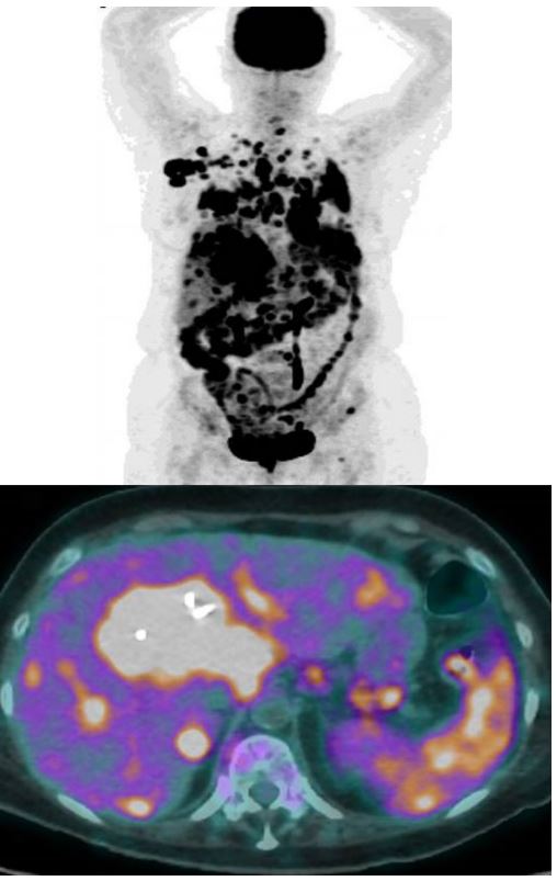 The needle biopsy returned positive for a lymphatic ganglion exhibiting lymphoproliferation B CD 20-, CD 30+, CD15 -/+ EBV+, suggestive in the first instance of classical Hodgkin’s lymphoma. The positron emission tomography revealed multiple hypermetabolic lymph nodes, liver, bone and lung lesions, as well as splenomegaly with diffuse splenic hypermetabolism and multiple focal splenic hypermetabolic lesions, consistent with lymphomatous involvement (Figure 3). The diagnosis of classical Hodgkin’s lymphoma was confirmed with incisional biopsy on a hypermetabolic right axillary lymph node.