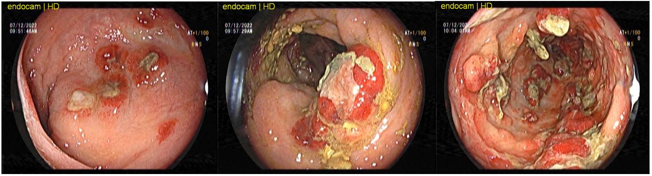 In addition, serum CMV DNA load: 2461 IU/mL, tissue CMV DNA from the colon mucosa was determined 31,779,821 IU/ mL; AZA was discontinued; low dose methylprednisolone and mesalazine were continued. Valganciclovir treatment was started for CMV colitis. In December 2022, the patient was consulted to the medical oncology clinic due to KS. The patient was evaluated for sarcoma metastasis with Positron Emission Tomography/Computed Tomography (PET/CT); and no metastasis was observed, there was diffuse sarcoma infiltration throughout the colonic mucosa. In multidisciplinary oncology meeting; liposomal doxorubicin treatment was planned for the patient. Although it was emphasized that it was important to comply the treatment, the patient left the follow-up.