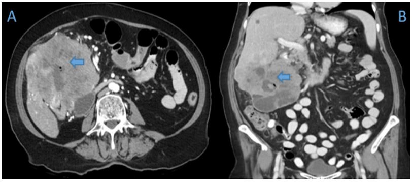 A 70-year old female was referred to the emergency department of a tertiary hospital by her general practitioner with a sixmonth history of lethargy, six-kilogram weight loss and vague right sided abdominal pain. She denied vomiting, altered bowel habit or rectal bleeding. Her relevant surgical history included cholecystectomy and thyroidectomy. There was no family history of colorectal cancer. Pertinent examination findings included a soft, non-distended abdomen with a large non-mobile palpable mass in the right upper quadrant. Her blood profile included leukocytosis (12.9 x109 /L), anaemia (Hb 79 g/L), normal bilirubin and mildly deranged liver function tests. Furthermore, she had a markedly raised CA 19.9 (5506 kU/L) and CEA (462.1 microg/L). She was admitted for a blood transfusion and further investigations. A triple phase computed tomography scan of the chest, abdomen and pelvis revealed an 11x10x10.5 cm hepatic flexure mass with invasion into the right hepatic lobe (Figure 1). Surprisingly, there was no evidence of colonic obstruction, nor distant metastatic disease. A colonoscopy demonstrated a large circumferential, fungating and partially obstructing mass extending into the ascending colon (Figure 2). Biopsy confirmed a poorly differentiated invasive adenocarcinoma (Figure 3). Following discussion at a multi-disciplinary surgical oncology meeting, she proceeded to an ileo-colonic bypass with planned adjuvant chemotherapy. Intra-operatively, the mass was invading the liver, with small amounts of ascites and no peritoneal metastasis. Proximal small and large bowel were of normal caliber. An ileo-colic side-to-side anastomosis was performed using the distal ileum and mid transverse colon. The patient made an uneventful recovery and was discharged day four post operatively with medical oncology follow up.