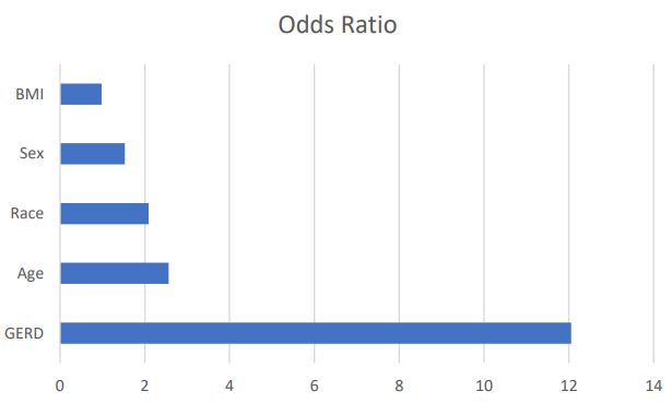 Overall, 5,223,305 patients had at least one BE risk factor, including GERD, male sex, white blood cell count, advanced age >50 years, or obesity. On logistic regression analysis, when adjusting for residence-poverty and health insurance, GERD was the most predictive of BE prevalence (OR=12.05 [11.6-12.5]). This was followed by age >50 years (odds ratio [OR]=2.6[2.5- 2.7]), white race (OR=2.1[2.0-2.2]), and male sex (OR=1.53 [1.49-1.57]). However, obesity did not confer a higher BE rate in this population (0.98 [0.96, 1.01]) (Table 2, Figure 1).