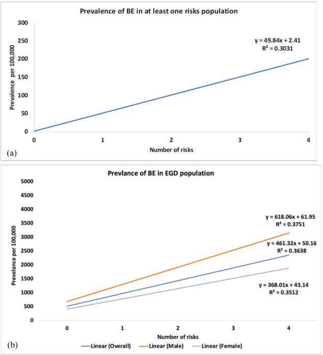 In this study, we used a multicenter, state-wide, real-world, large database to assess the strength of the association between BE risk factors and its prevalence. We reported that BE risk factors conferred variable risk of BE, with GERD being the most predictive, followed by age >50 years, white race, and male sex. Furthermore, we reported that the number of BE risk factors was positively associated with the prevalence of BE; as the number of BE risk factors increased, the risk of BE increased linearly. This trend was true for both males and females but was more pronounced in males.
