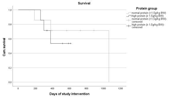Survival: A 13-week protein supplementation above guideline recommendations did not result in a survival benefit (p=0.502, Figure 1).