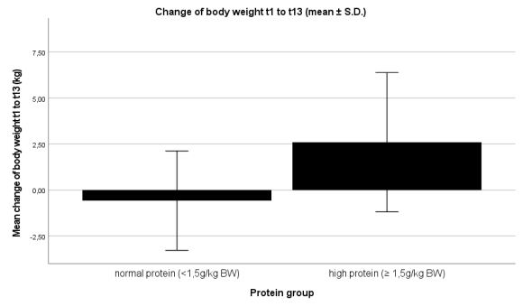 In NP, mean protein intake was 87.4±36.5 g at t1 and 79.1±26.2 g at t13. The mean change in protein intake from t1 to t13 was -8.3±39.3. The mean protein intake in g/kg BW was 1.3±0.4 at t1 and 1.2±0.3 g at t13. The mean change in protein intake from t1 to t13 was -0.1±0.6 g/kg BW.