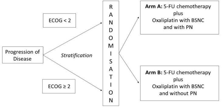 Abbrevations: AE: Adverse Events; BCM: Body Cell Mass; BIA: Bio Impedance Analysis; BMI: Body-Mass-Index; BSNC: Best Supportive Nutritional Care; BW: Body Weight; CRP: C-Reactive Protein; Ctx: Chemotherapy; ECM: Extracellular Mass; FA: Folinic Acid; HEN: Home Enteral Nutrition; HP: High Protein; mGPS: Modified Glasgow-Prognostic-Score; NP: Normal Protein; ONS: Oral Nutritional Supplement; PAL: Physical Activity Level; PN: Parenteral Nutrition; SAE: Serious Adverse Event; 5-FU: 5-Fluorouracil.