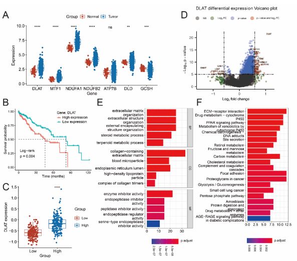 The data was analyzed by functional enrichment to clarify further the function underlying potential targets. To better understand the carcinogenesis of mRNA, “Cluster Profiler” package in R was employed to analyze the GO function of potential targets and enrich the KEGG pathway. The DEGs (differential expressed genes) were identified in the high-risk and low-risk groups or the DEGs between DLAT expression high-group and low-group were calculated by the limma package, then screened with FDR < 0.05 and |Fold change| > 1.5 to identify the differences. The enriched results for GO and KEGG analysis were visualized by “ggplot2” package.