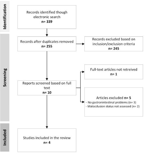 Eligible articles included human studies, with participants of any age and gender. Only studies including subjects with a reported history of dental or dentoskeletal malocclusion and gastrointestinal problems were included. Investigations of patients with syndromes or congenital gastrointestinal disorders were excluded. No studies were excluded based on geographic location, racial, or gender-based interests, or details about the specific study setting. This review considered both experimental and quasi-experimental study designs. Analytical observational studies including prospective and retrospective cohort studies, case-control studies, and analytical cross-sectional studies, as well as descriptive cross-sectional studies, case series and case reports. Only primary research studies were included. Text and opinion papers, narrative reviews, conference abstracts were not included in this review, due to the lack of peer review processing. Table 1 provides a more detailed outline of the inclusion/exclusion criteria for article selection.