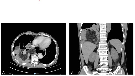Ten months postoperatively, the patient presented to the emergency department on January 25, 2024, with “abdominal pain for 2 days, worsening for half a day,” characterized by continuous dull pain in the upper abdomen, alleviated when sitting or bending forward and severe when lying flat. He denied any history of vomiting or respiratory difficulty. Physical examination showed normal vital signs, severe tenderness in the right upper and upper abdomen, and normal bowel sounds. Initial laboratory results, including cardiac enzymes and electrocardiogram, showed no abnormalities. A thoracoabdominal CT scan indicated the esophagojejunostomy and dilated jejunal loops herniated through the hiatal hernia into the right hemithorax, forming a right-sided hiatal hernia (Figures 2A & 2B). There was no free fluid or air in the thoracic cavity.