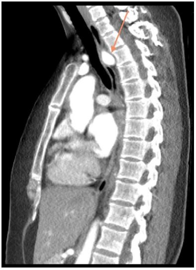 Dysphagia lusoria is a rare condition that occurs secondary to extrinsic esophageal compression by an aberrant right subclavian artery [1]. An aberrant right subclavian artery has a prevalence of 0.16-4.4% [2]. This anomaly is symptomatic in about 30% of cases identified by Figure 2. Dysphagia is the most common related symptom, reported in 90% of cases [1,2]. Other reported symptoms include cough, dyspnea, and chest pain [3].