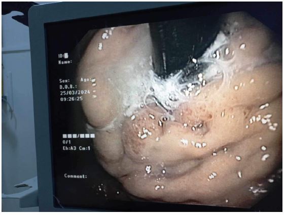 The patient received intravenous Sandostatin and proton pump inhibitors. Upper GI endoscopy revealed mild portal hypertensive gastropathy and a large gastric varix with red signs in the fundus, extending to involve esophageal varices (GOV 2), as per Sarin classification (Figure 1) [3]. Endoscopic sclerotherapy was performed with an injection of 1.5 ml N-Butyl-2-cyanoacrylate (Glubran®) diluted (50/50) with lipiodol into the fundic varix with red signs, under general balanced anesthesia. Airway management and intubation were uneventful. Injection sclerotherapy achieved successful hemostasis, maintaining stable hemodynamic and respiratory status throughout the procedure.