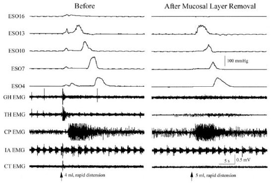 It was found that distension or contraction of the esophagus [24,29,32,35] was associated with contraction of the esophagus orad of the stimulus (Esophago-Esophageal Contractile Reflex (EECR)) and/or the upper esophageal sphincter (Esophago-UES Contractile Reflex (EUCR)), and usually followed by Secondary Peristalsis (SP). The most significant study [30] associating the slowly-adapting muscular mechanoreceptor with these reflexes was the observation that removal of the mucosal layer of the esophagus blocked all reflexes stimulated by distension of the esophagus except the EUCR, EECR, and SP (Figure 1). Considering that no other receptor had been found in the muscular layer or that anesthetizing the mucosa with lidocaine did not block SP or EUCR [30], these reflexes must have been mediated by muscular mechanoreceptors. This was further confirmed by the observations that the EUCR and SP were more readily activated by a slowly rather than rapidly applied tension to the esophageal wall and that these reflexes were not activated by stroking the esophageal mucosa [30]. Therefore, the slowly-adapting muscular mechanoreceptor mediates EUCR, EECR, and SP.