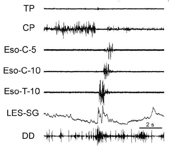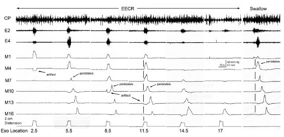 The functions of EUCR, EECR and 2P are complimentary, and when acting together unified. The EECR acts to block or inhibit the orad movement of any esophageal bolus orad of the stimulus [35], the EUCR acts to prevent esophago-pharyngeal reflux of the bolus [30] and SP acts to move distally a bolus orad of the stimulus [3,6]. Therefore, since all three reflexes are activated by the same stimulus in the same region of the esophagus [30], these three reflexes have a unified function of preventing any bolus remaining in the esophagus after the passage of peristalsis to be refluxed to the pharynx.