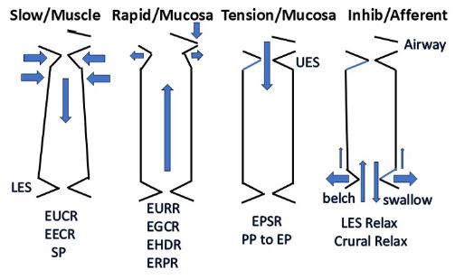 There are four histologically defined esophageal mechanoreceptive agents with evidence-based functions, three are mechanoreceptors and one is a mechanoreceptive inhibitory afferent nerve. The slowly-adapting tension sensitive receptors of the esophageal myenteric plexus function to prevent Esophago-Pharyngeal Reflux (EPR) through the Esophago-Upper Esophageal Sphincter Contractile Reflex (EUCR), Esophago-Esophageal Contractile Reflex (EECR), and Secondary Peristalsis (SP). The rapidly-adapting touch sensitive receptors of the esophageal mucosa function to promote EPR and airway protection during belching through esophago-upper Esophago-Upper esophageal sphincter Relaxation Reflex (EURR), Esophago-Glottal Closure Reflex (EGCR), Esophago-Hyoid Distraction Reflex (EHDR), and Esophageal Retrograde Peristaltic Reflex (ERPR). The slowly-adapting tension receptors of the mucosa function to promote bolus transport from pharynx to stomach by activating the Esophago-Pharyngeal Swallow Reflex (EPSR) instead of SP, especially in infant humans and animals, and ensuring that the esophageal phase of swallowing follows the pharyngeal phase. The afferent receptive inhibitory motor neurons innervating the LES and crural diaphragm function to eliminate the esophago-gastric barrier, i.e., LES and crural diaphragm contraction, during swallowing and belching. There are also undefined mechanoreceptors of the esophagus which activate splanchnic nerve afferents and probably mediate autonomic and nociceptive functions. However, the specific receptors as well as responses involved have not been identified.