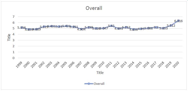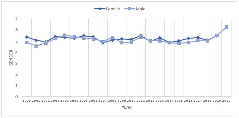 There was a total of 38,242 Crohn’s disease-related deaths from 1999 to 2020 which spiked from 2018 onwards with a significant APC value of 11.18 compared to a mere -0.14 throughout 1999 to 2018. The overall Average Annual Percent Change (AAPC) from 1999 to 2020 for Crohn’s disease mortality was 0.886 with a p-value of 0.05.