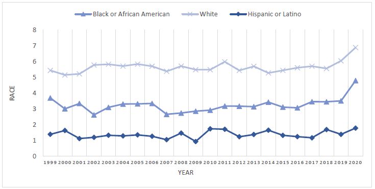 Methods: We analyzed Death Certificates from the Centers for Disease Control and Prevention (CDC) Wide Ranging Online Data for Epidemiological Research (WONDER) database from 1999-2020. AAMR per 1,000,000 people and Annual Percent Change (APC) with a 95% confidence interval were determined. We then used the Joinpoint Regression Program to obtain trends amongst epidemiological (race, ethnicity, gender, age) and demographic (census region, 2013 urbanization status) groups.