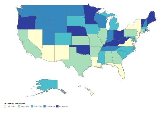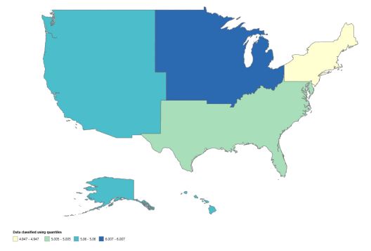 The non-parametric test in STATA revealed a z-value of -4.33 (p>z=0.00). Independent samples Kruskal Wallis test rejected the null hypothesis “the distribution of AAMRs is same across Census regions” with a p-value of 0.000. Post-hoc Dunn’s test of significance supported the results. The US census regions heatmap based on mortality from Crohn’s disease is given below.