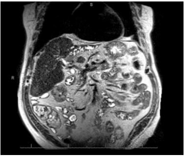 The gastroenterology service was consulted on hospital day 3 for evaluation of cirrhosis and new-onset obstructive jaundice. By this time, the patient’s abdominal pain had resolved, and his conjugated bilirubin had fallen to 2.3 mg/dL, indicating a possible passed stone. Magnetic Resonance Cholangiopancreatography (MRCP) was ordered for further workup of the liver mass and revealed an ill-defined, hypoenhancing mass at the liver hilum, with isolated left intrahepatic biliary dilatation and lobar atrophy (Figure 1).