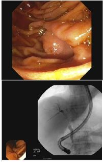 The enhancement characteristics and location were most suspicious for cholangiocarcinoma. The patient was discharged from the hospital and scheduled for Endoscopic Retrograde Cholangiopancreatography (ERCP) the following week. The patient underwent ERCP with Endoscopic Ultrasound (EUS) which demonstrated a 3 cm intraductal hilar mass extending to the right hepatic duct (Figures 2 & 3).